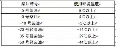 為了使發動機擁有更高的可靠性和更好的經濟型,柴油應選用符合19147-2018國六標準的正規柴油,并隨著地區環境氣溫的不同而選用不同牌號的清潔柴油。根據使用環境氣溫,按下表選用不同牌號的清潔柴油: